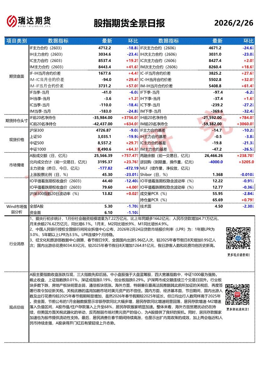 瑞达期货-股指期货全景日报-260226