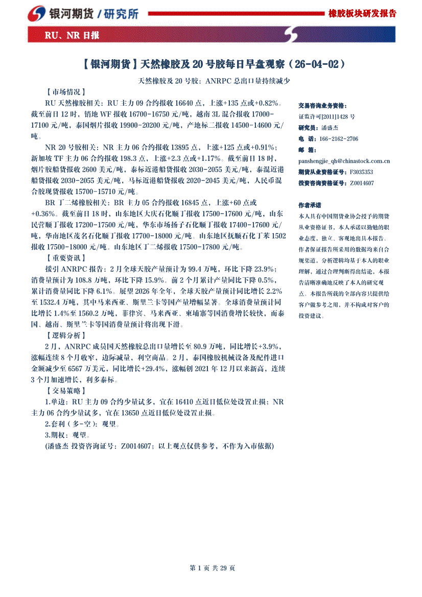银河期货-天然橡胶及20号胶每日早盘观察-260402