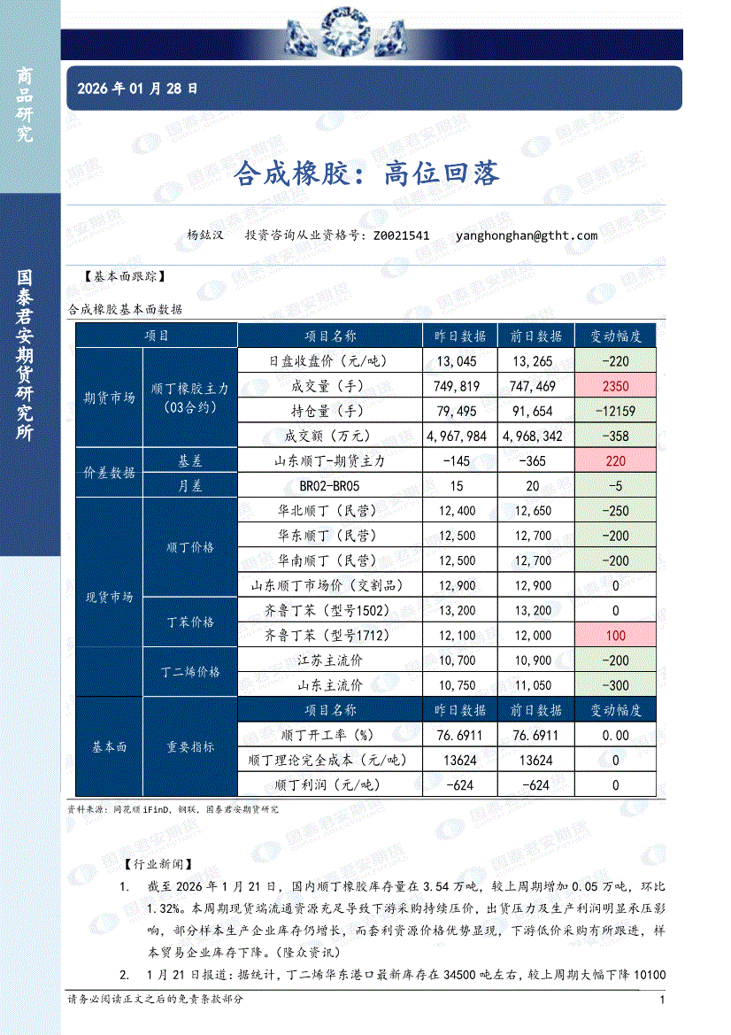 国泰君安期货-合成橡胶:高位回落-260128