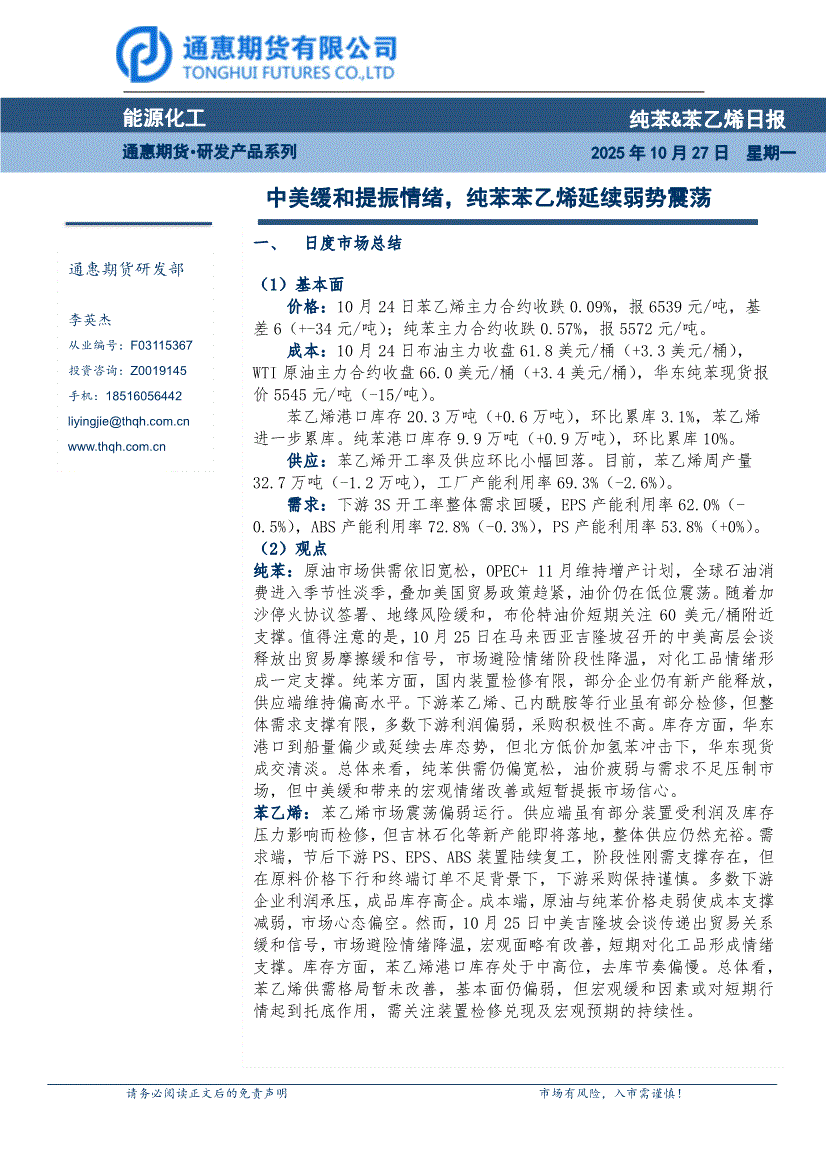 通惠期货-纯苯&苯乙烯日报:中美缓和提振情绪,纯苯苯乙烯延续弱势震荡-251027