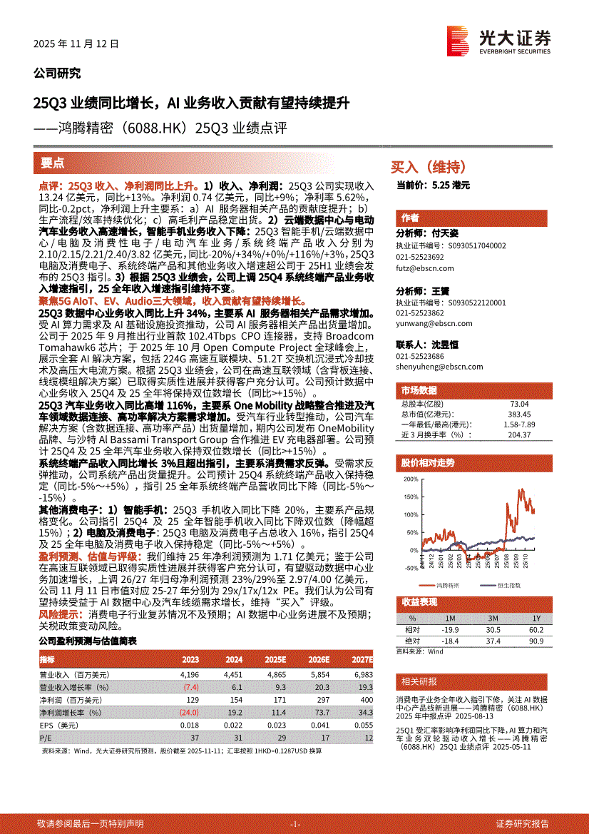 鸿腾精密:光大证券-鸿腾精密-6088.HK-25Q3业绩点评:25Q3业绩同比增长,AI业务收入贡献有望持续提升-251112