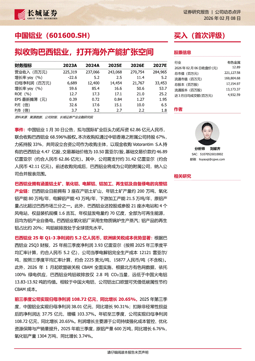 中国铝业:长城证券-中国铝业-601600-拟收购巴西铝业,打开海外产能扩张空间-260208