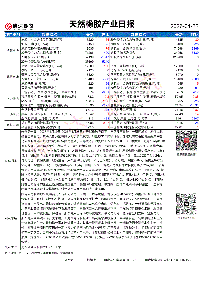 瑞达期货-天然橡胶产业日报-260422