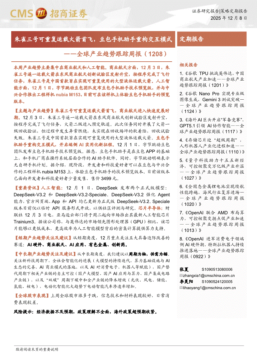 招商证券-全球产业趋势跟踪周报:朱雀三号可重复运载火箭首飞,豆包手机助手重构交互模式-251208