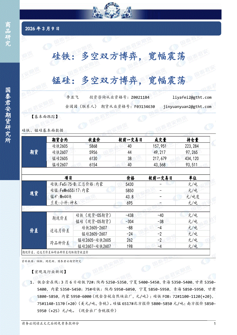 国泰君安期货-硅铁:多空双方博弈,宽幅震荡,锰硅,多空双方博弈,宽幅震荡-260309