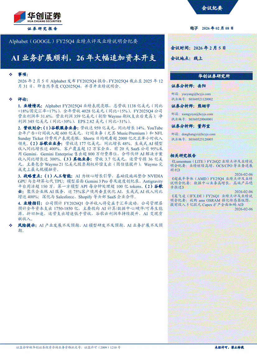 Alphabet:华创证券-Alphabet-GOOGL.US-FY25Q4业绩点评及业绩说明会纪要:AI业务扩展顺利,26年大幅追加资本开支-260208
