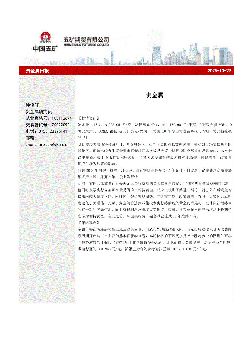 五矿期货-贵金属周报:美联储表态终止缩表,金银价格短期企稳-251101