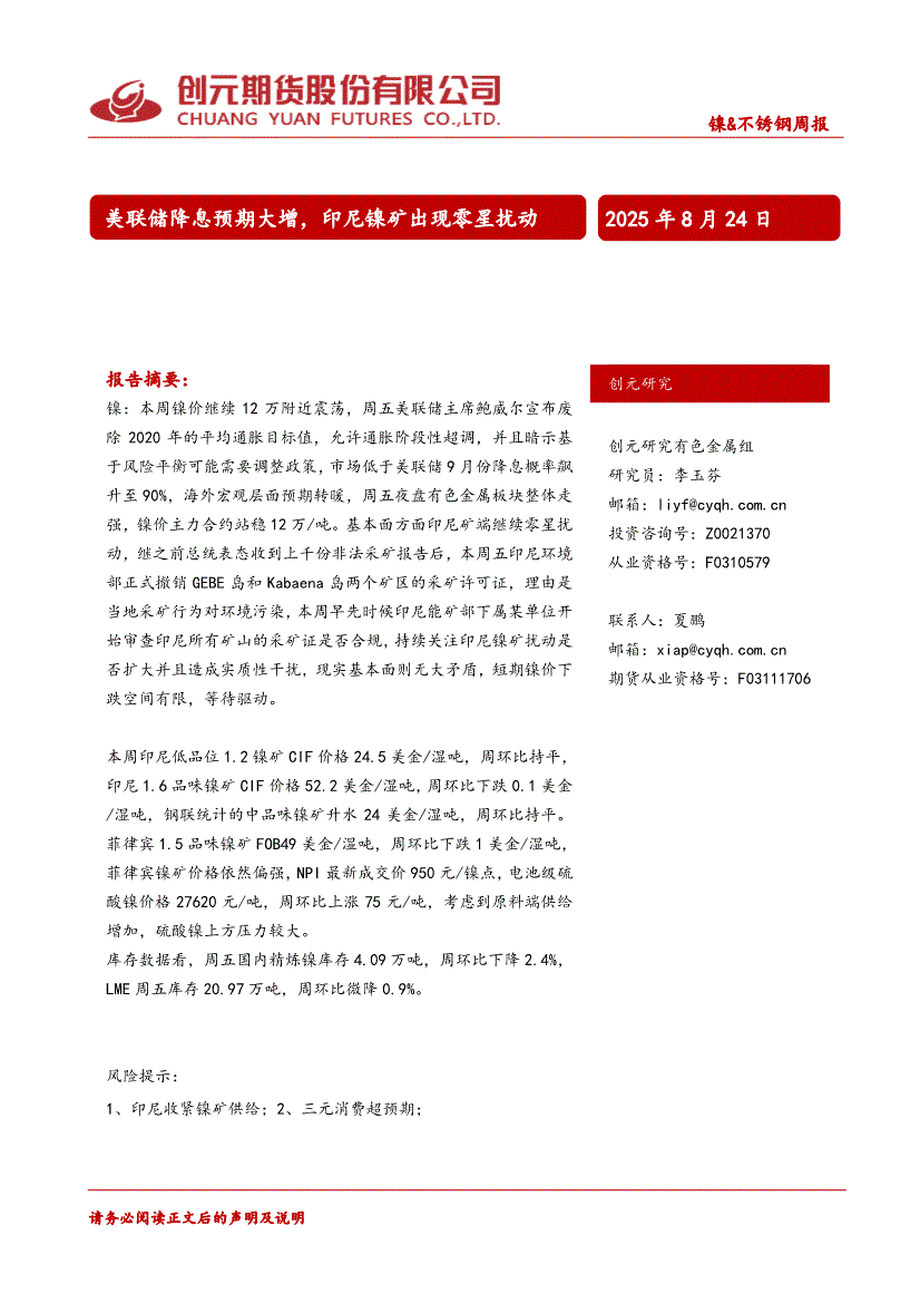 创元期货-镍&不锈钢周报:美联储降息预期大增,印尼镍矿出现零星扰动-250824
