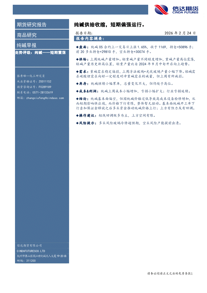 信达期货-纯碱早报:纯碱供给收缩,短期偏强运行。-260224