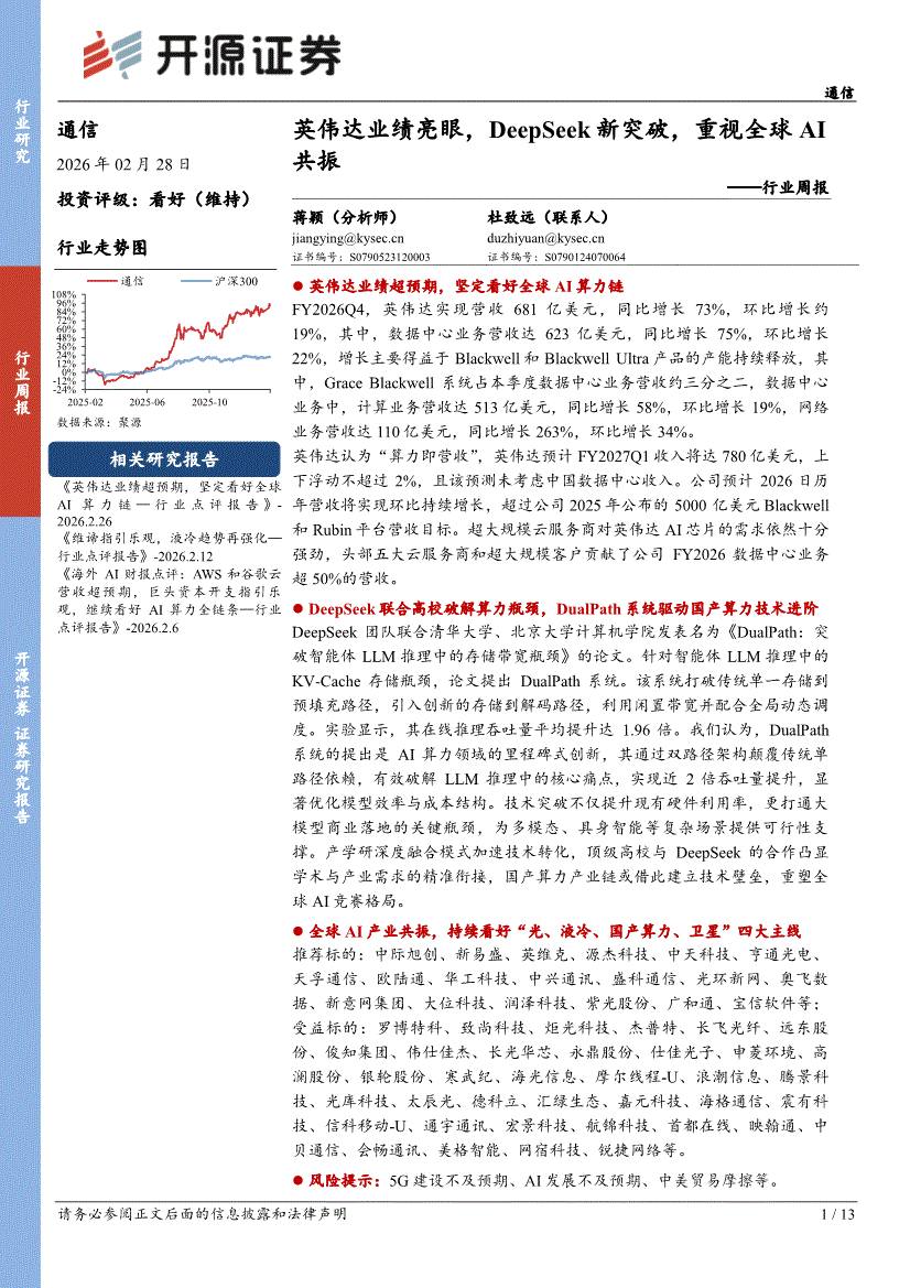 通信行业:开源证券-通信行业周报:英伟达业绩亮眼,DeepSeek新突破,重视全球AI共振-260228
