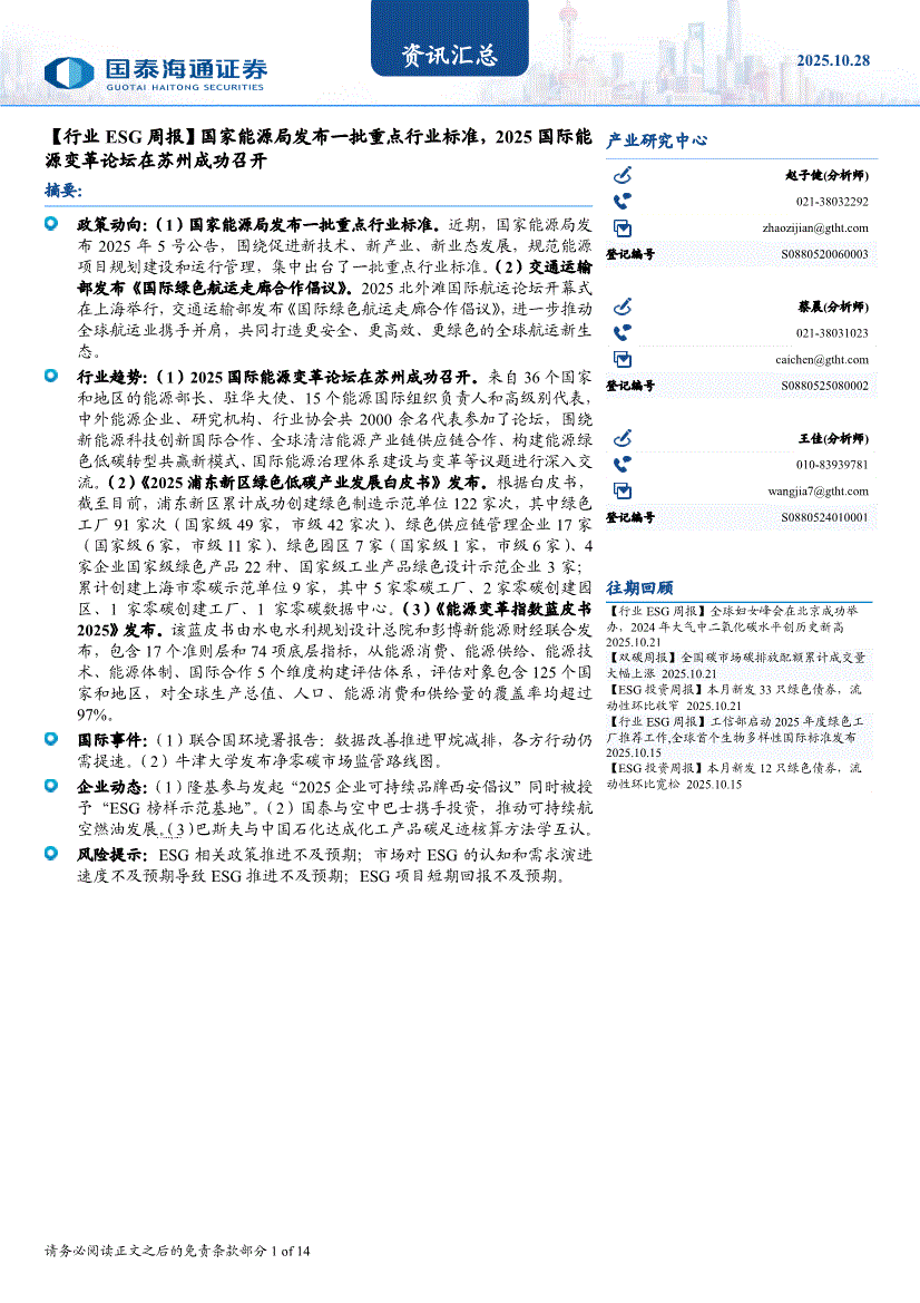 国泰海通证券-资讯汇总:【行业ESG周报】国家能源局发布一批重点行业标准,2025国际能源变革论坛在苏州成功召开-251028