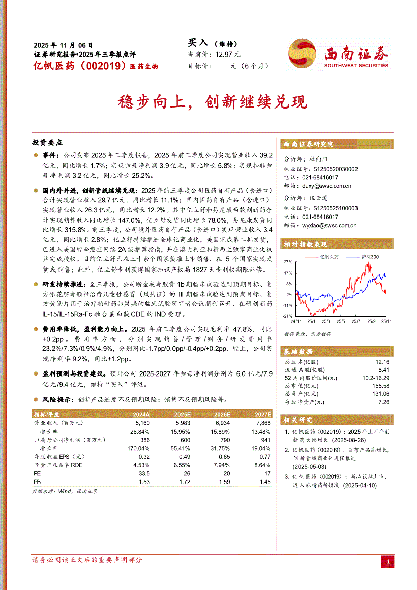 亿帆医药:西南证券-亿帆医药-002019-稳步向上,创新继续兑现-251106