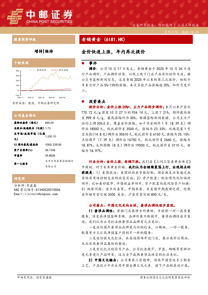 老铺黄金:中邮证券-老铺黄金-6181.HK-金价快速上涨,年内再次提价-251028
