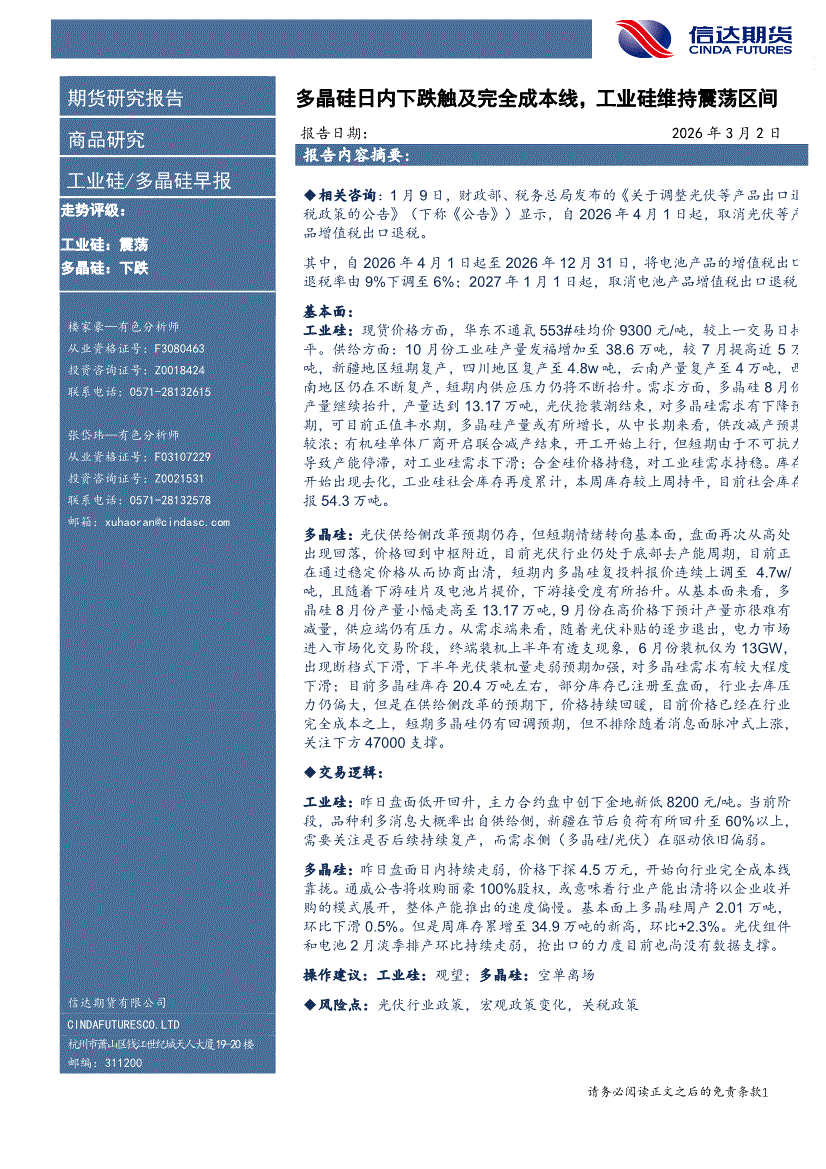 信达期货-工业硅/多晶硅早报:多晶硅日内下跌触及完全成本线,传合盛已有复产-260303