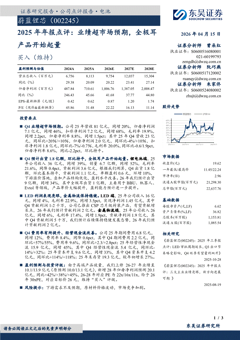 蔚蓝锂芯:东吴证券-蔚蓝锂芯-002245-2025年年报点评:业绩超市场预期,全极耳产品开始起量-260415