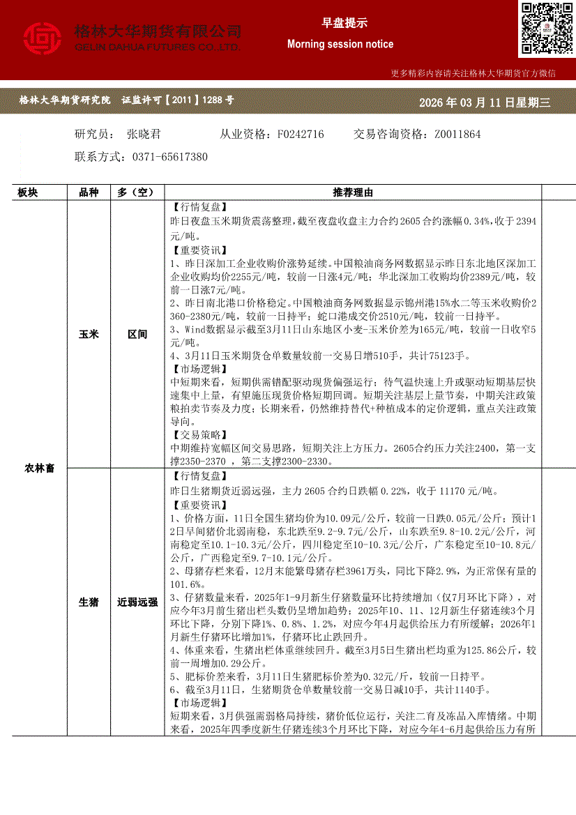 格林大华期货-早盘提示:玉米生猪鸡蛋-260311