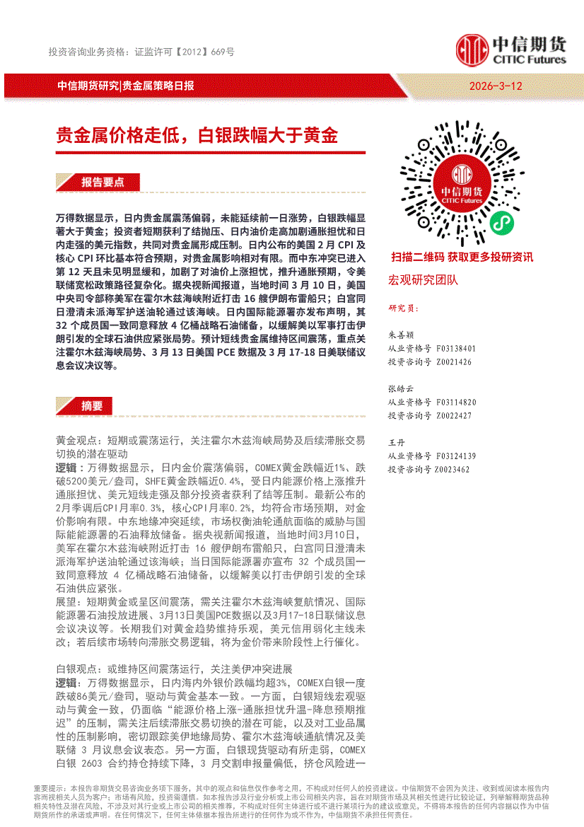 中信期货-贵金属策略日报:贵金属价格走低,白银跌幅大于黄金-260312