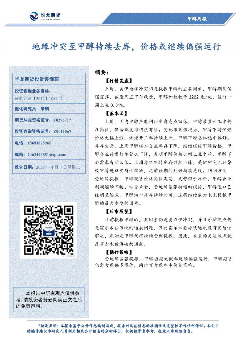 华龙期货-甲醇周报:地缘冲突至甲醇持续去库,价格或继续偏强运行-260407