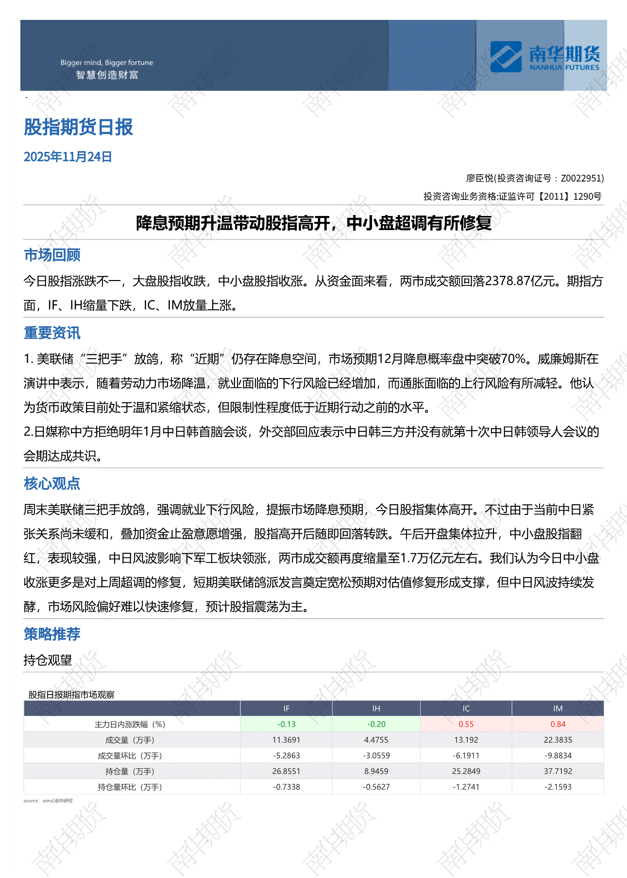 南华期货-股指期货日报:降息预期升温带动股指高开,中小盘超调有所修复-251124