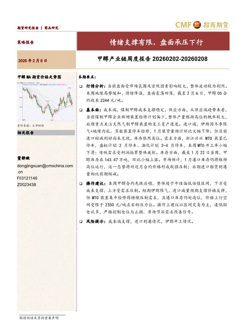 招商期货-甲醇产业链周度报告:情绪支撑有限,盘面承压下行-260208