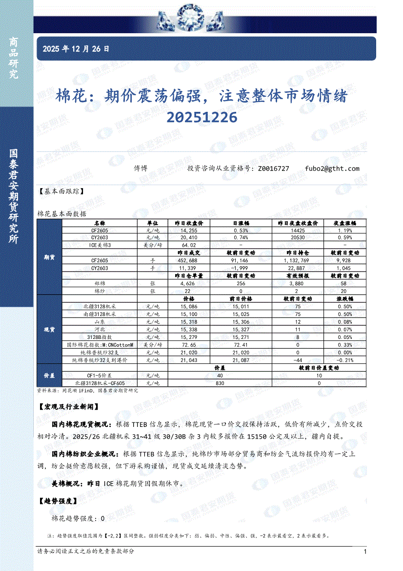 国泰君安期货-棉花:期价震荡偏强,注意整体市场情绪-251226