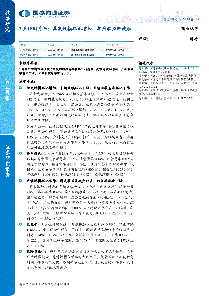 商业银行业:国泰海通证券-商业银行业3月理财月报:募集规模环比增加,单月收益率波动-260408