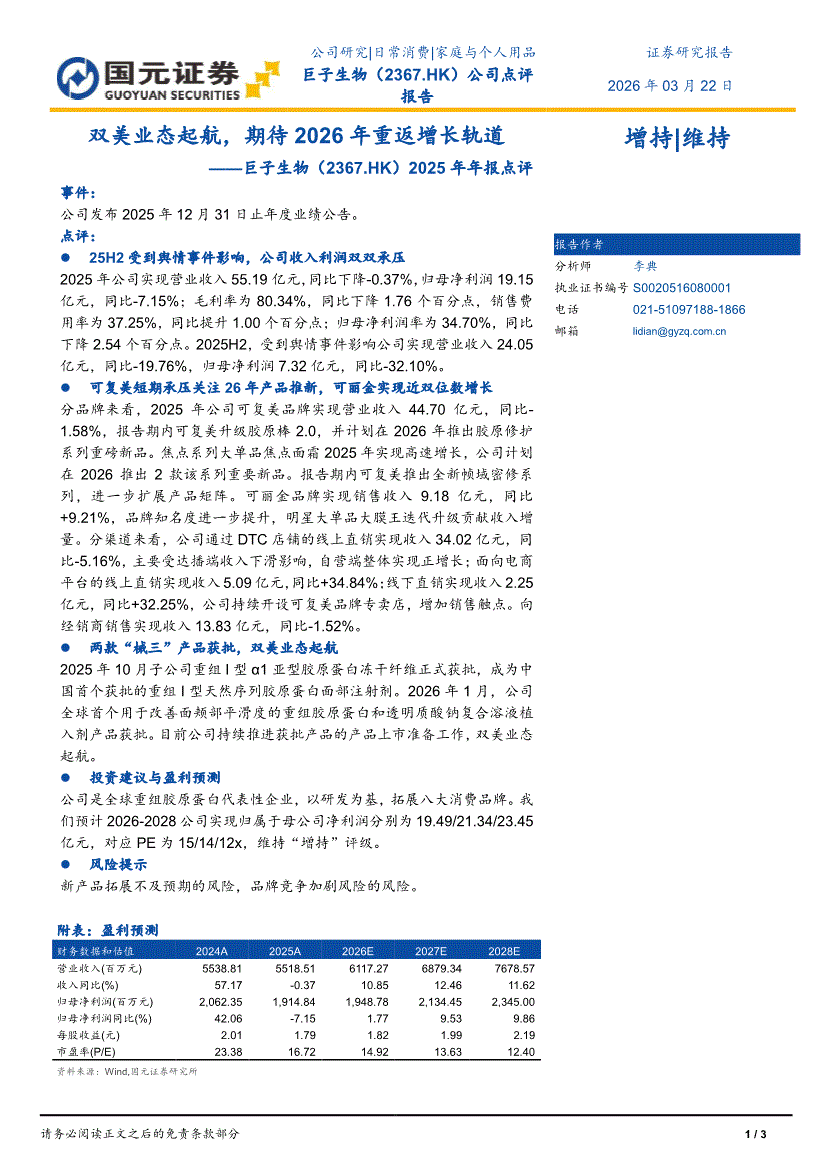 巨子生物:国元证券-巨子生物-2367.HK-2025年年报点评:双美业态起航,期待2026年重返增长轨道-260322