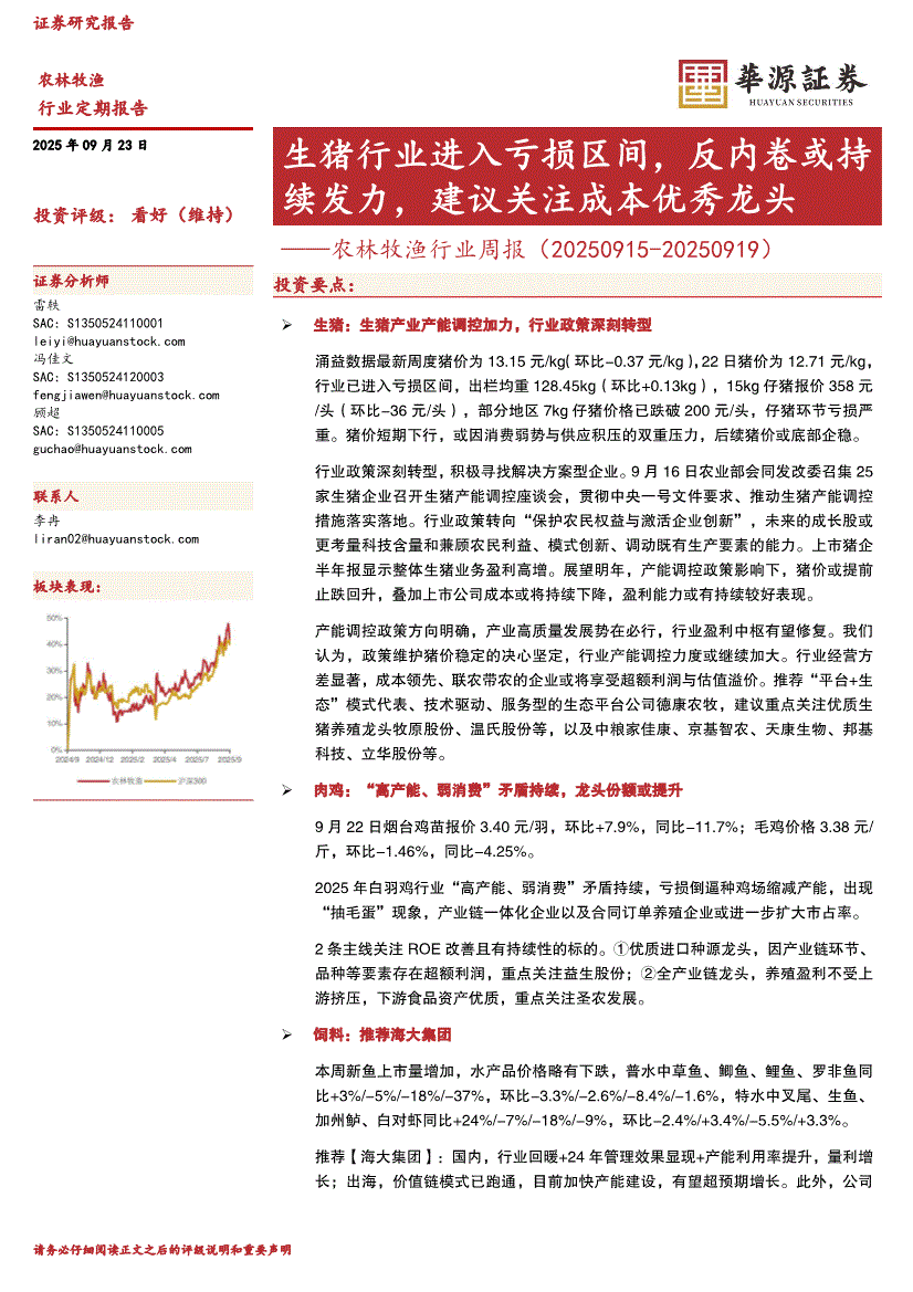 农林牧渔行业:华源证券-农林牧渔行业周报:生猪行业进入亏损区间,反内卷或持续发力,建议关注成本优秀龙头-250923