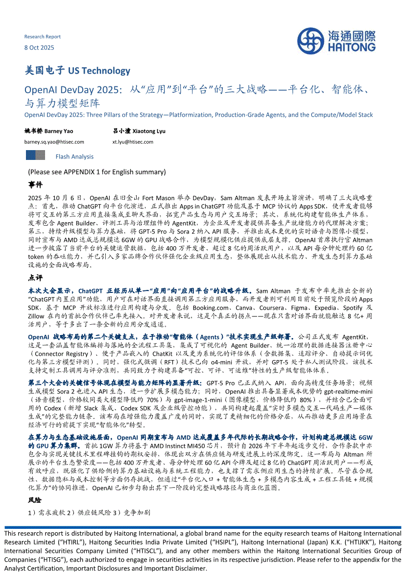 电子行业:海通国际-美国电子行业OpenAIDevDay2025:从“应用”到“平台”的三大战略——平台化、智能体、与算力模型矩阵-251008