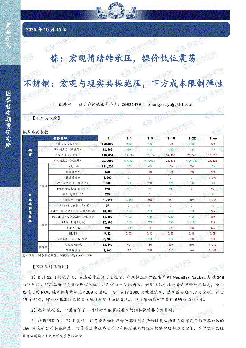 国泰君安期货-镍:宏观情绪转承压,镍价低位震荡,不锈钢,宏观与现实共振施压,下方成本限制弹性-251015