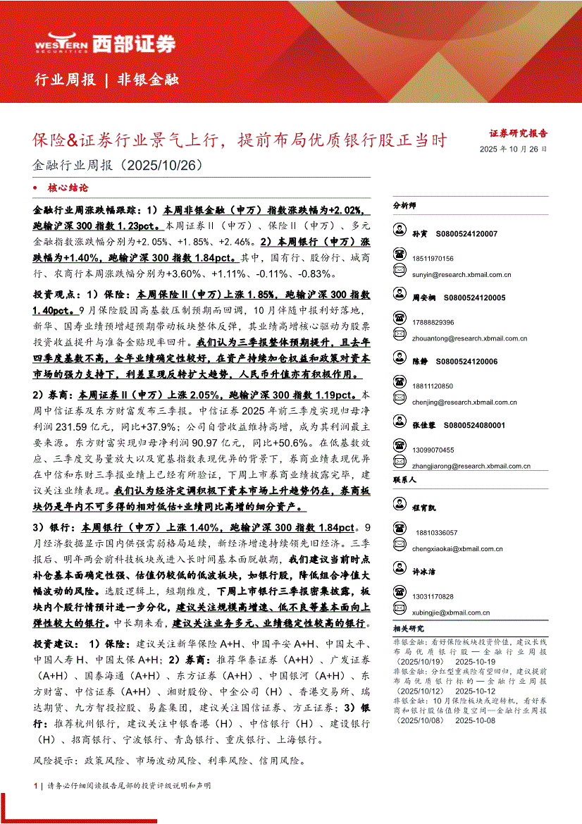 金融行业:西部证券-金融行业周报:保险&证券行业景气上行,提前布局优质银行股正当时-251026