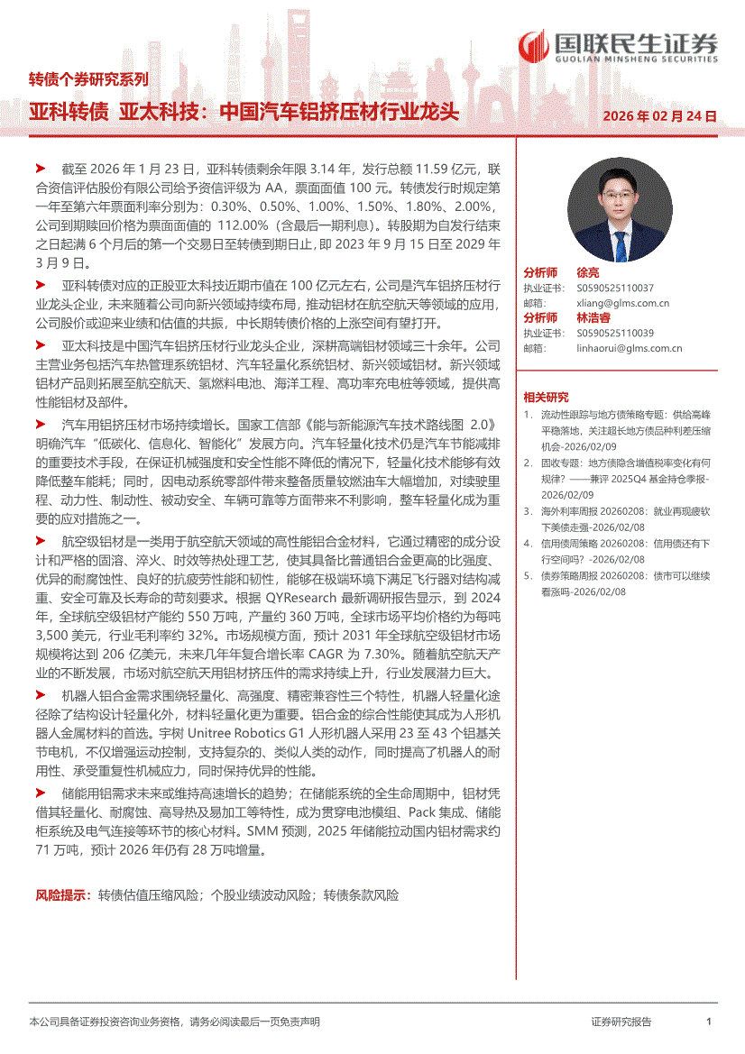 国联民生证券-转债个券研究系列:亚科转债,亚太科技,中国汽车铝挤压材行业龙头-260224