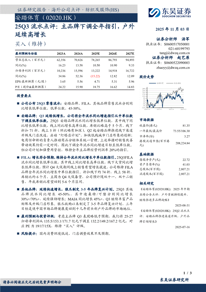 安踏体育:东吴证券-安踏体育-2020.HK-25Q3流水点评:主品牌下调全年指引,户外延续高增长-251103