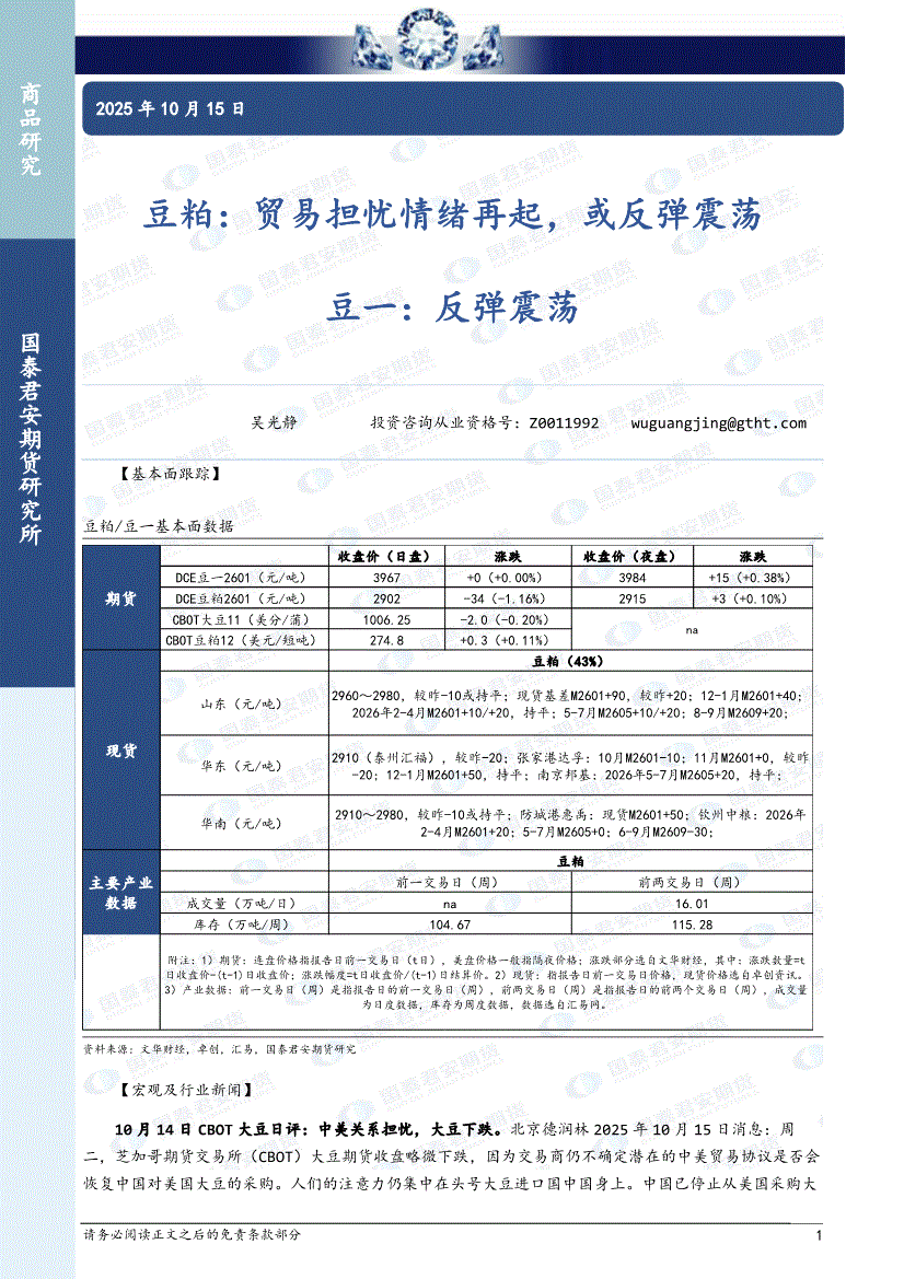 国泰君安期货-豆粕:贸易担忧情绪再起,或反弹震荡,豆一,反弹震荡-251015