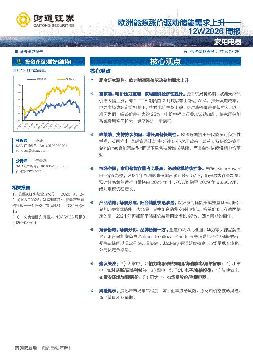 家用电器行业:财通证券-家用电器行业12W2026周报:欧洲能源涨价驱动储能需求上升-260325