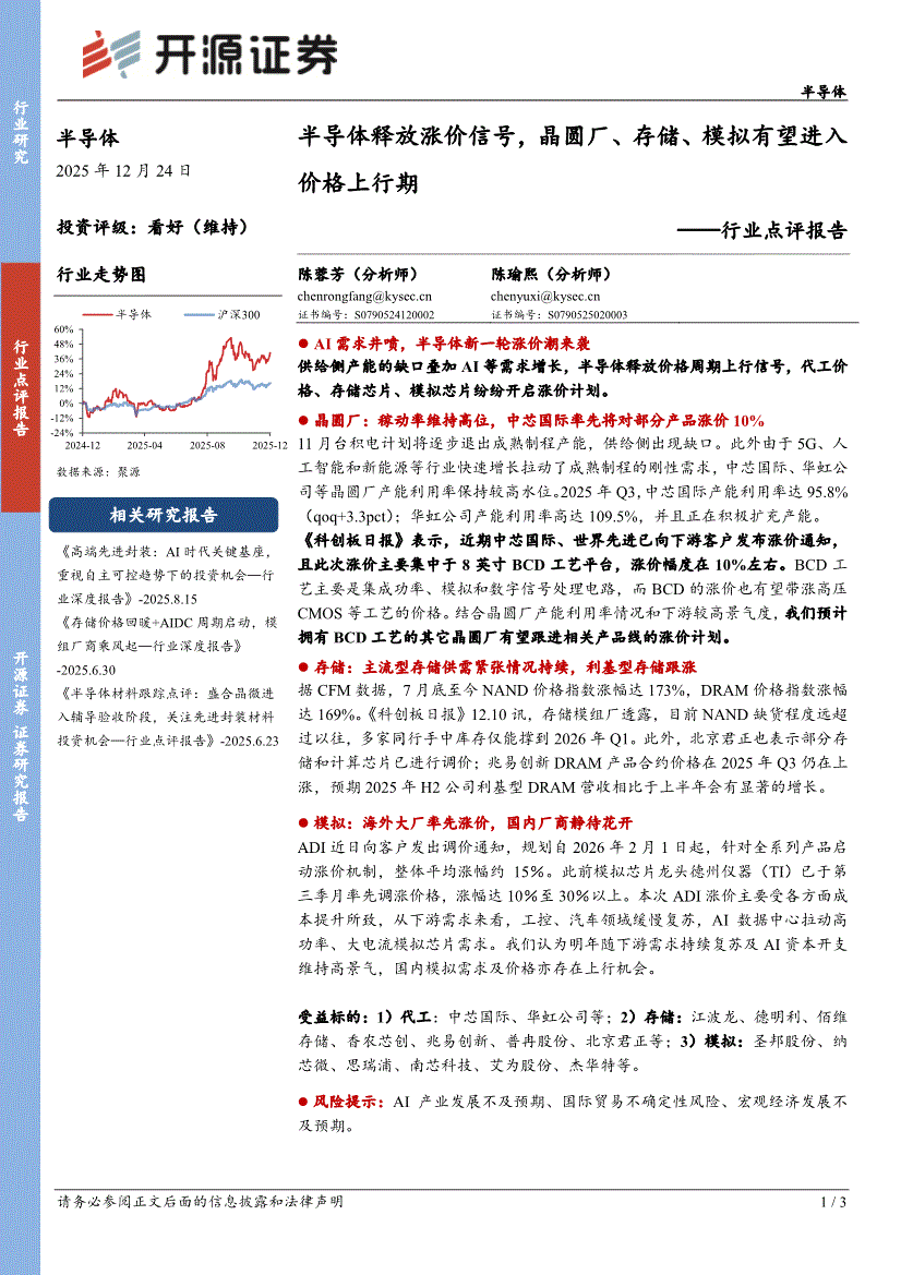 半导体行业:开源证券-半导体行业点评报告:半导体释放涨价信号,晶圆厂、存储、模拟有望进入价格上行期-251224