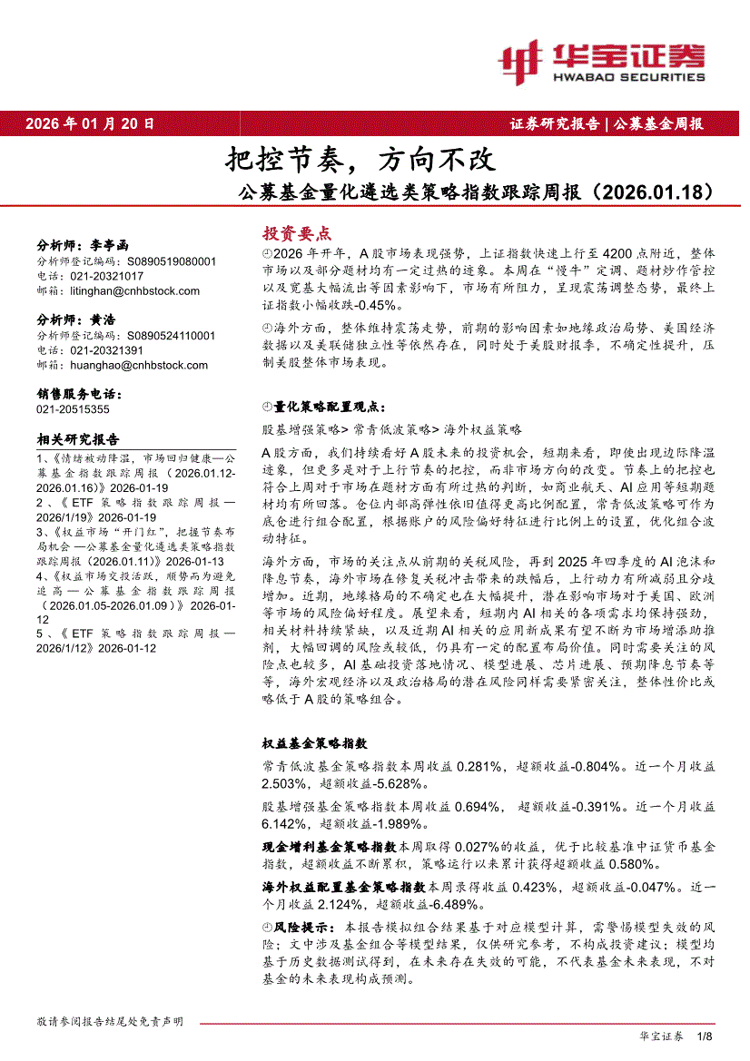 华宝证券-公募基金量化遴选类策略指数跟踪周报:把控节奏,方向不改-260120