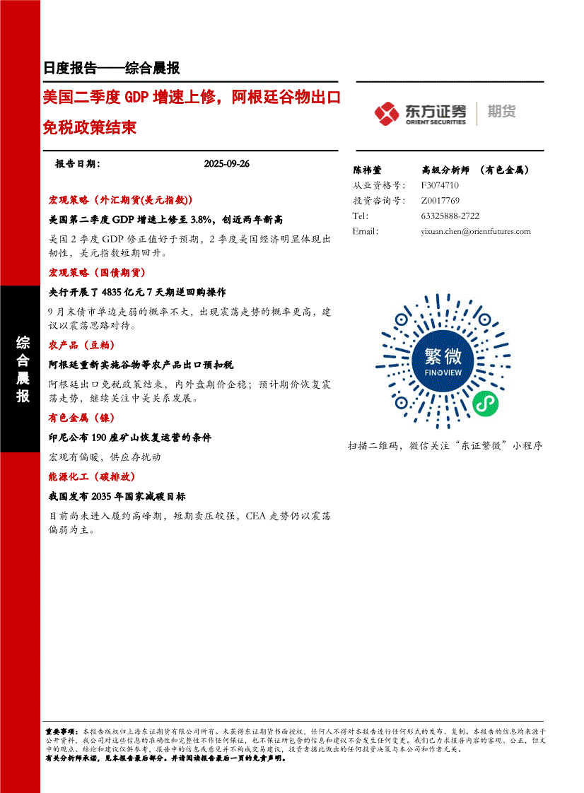 东证期货-综合晨报:美国二季度GDP增速上修,阿根廷谷物出口免税政策结束-250926