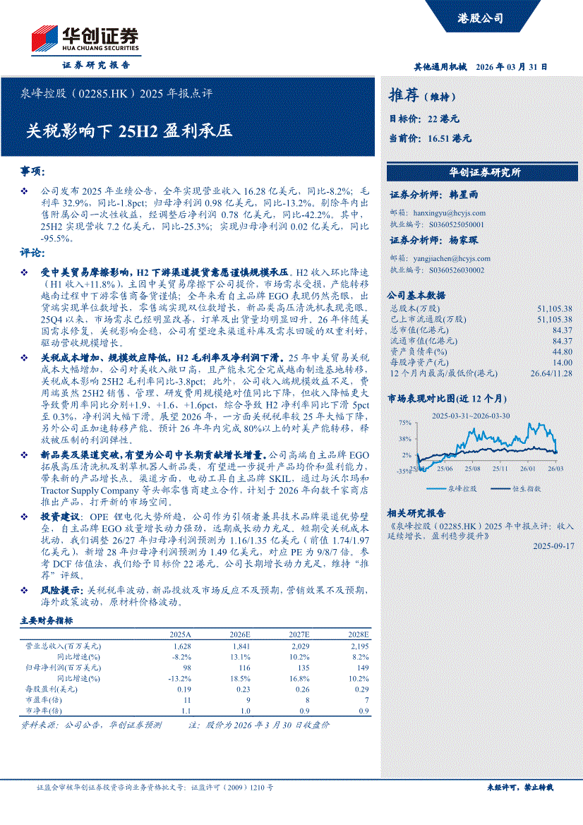 泉峰控股:华创证券-泉峰控股-2285.HK-2025年报点评:关税影响下25H2盈利承压-260331
