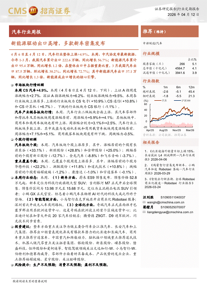 汽车行业:招商证券-汽车行业周报:新能源驱动出口高增,多款新车密集发布-260412