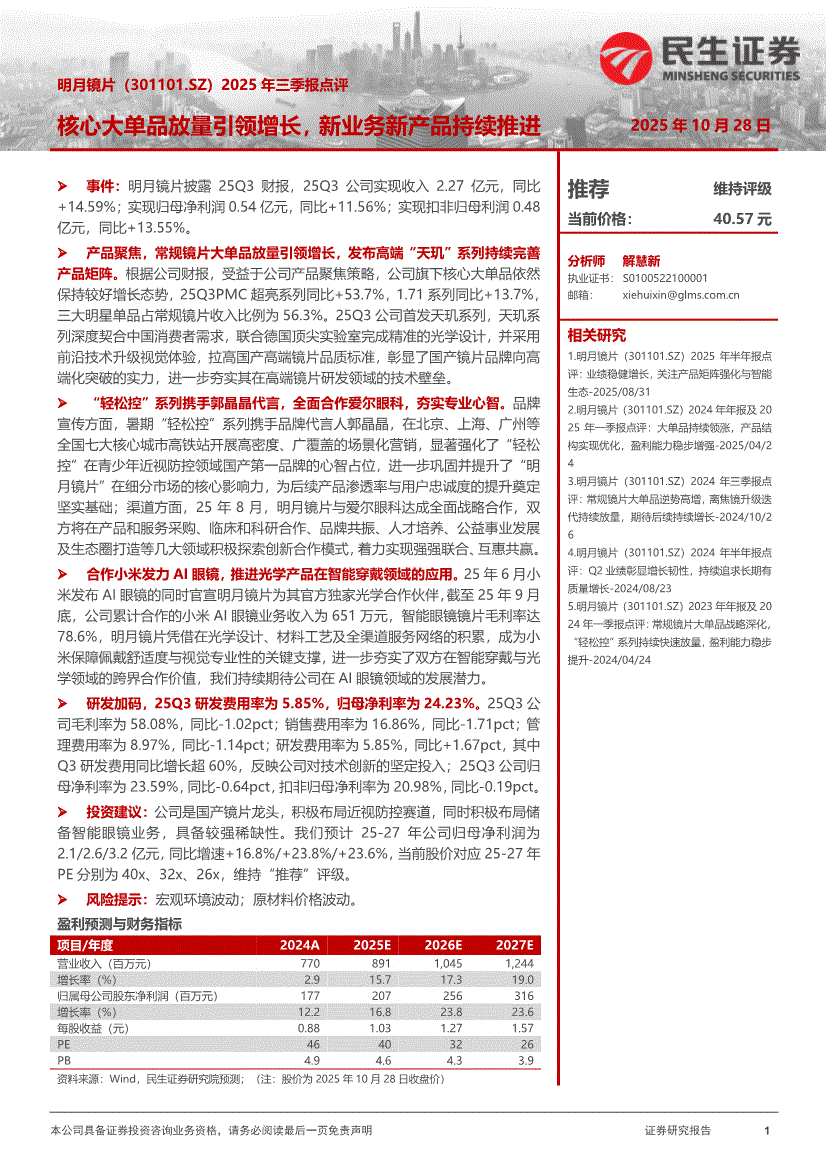 明月镜片:民生证券-明月镜片-301101-2025年三季报点评:核心大单品放量引领增长,新业务新产品持续推进-251028