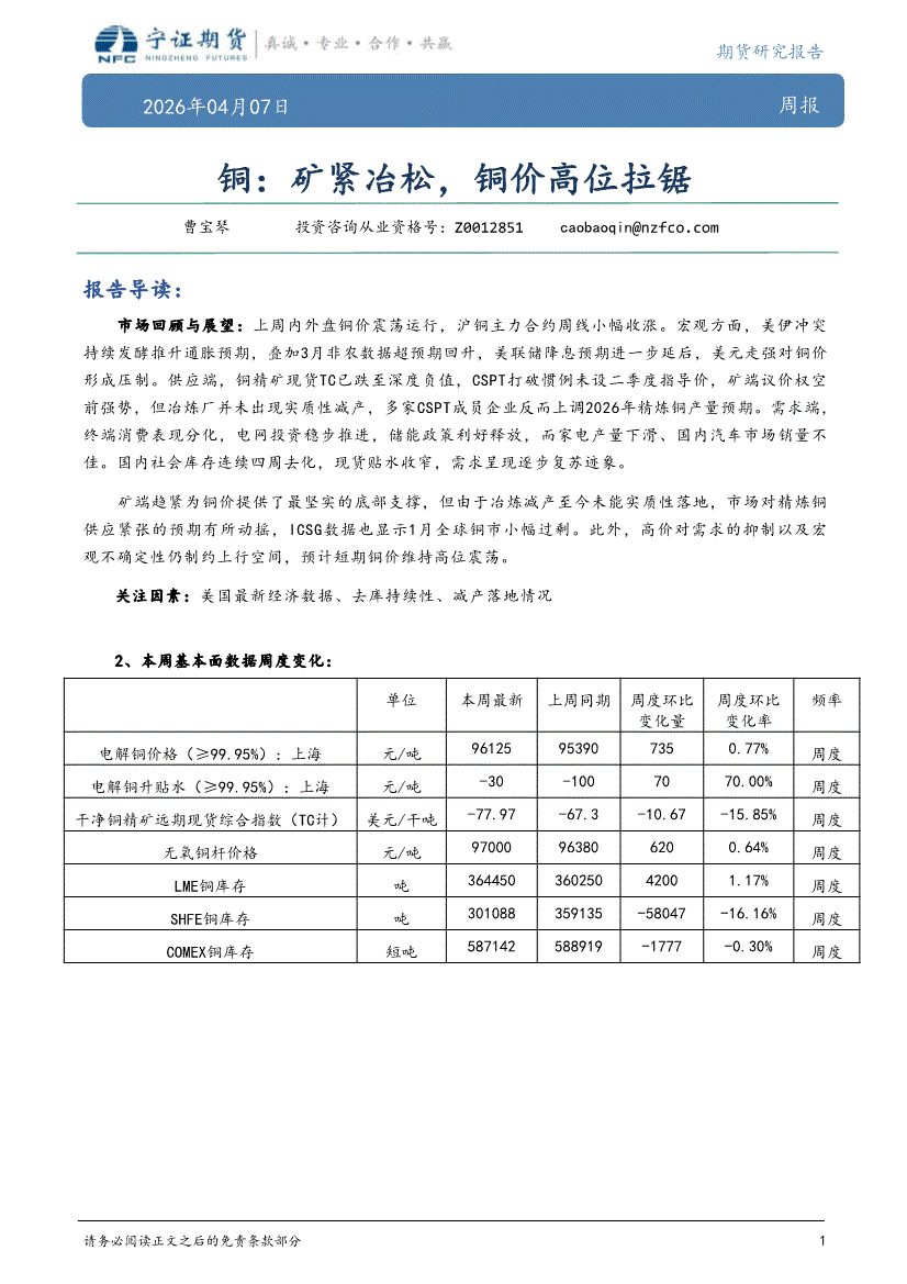 宁证期货-铜:矿紧冶松,铜价高位拉锯-260407