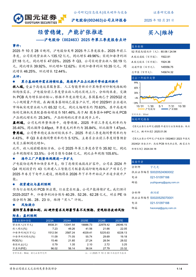 沪电股份:国元证券-沪电股份-002463-2025年三季度报告点评:经营稳健,产能扩张推进-251031
