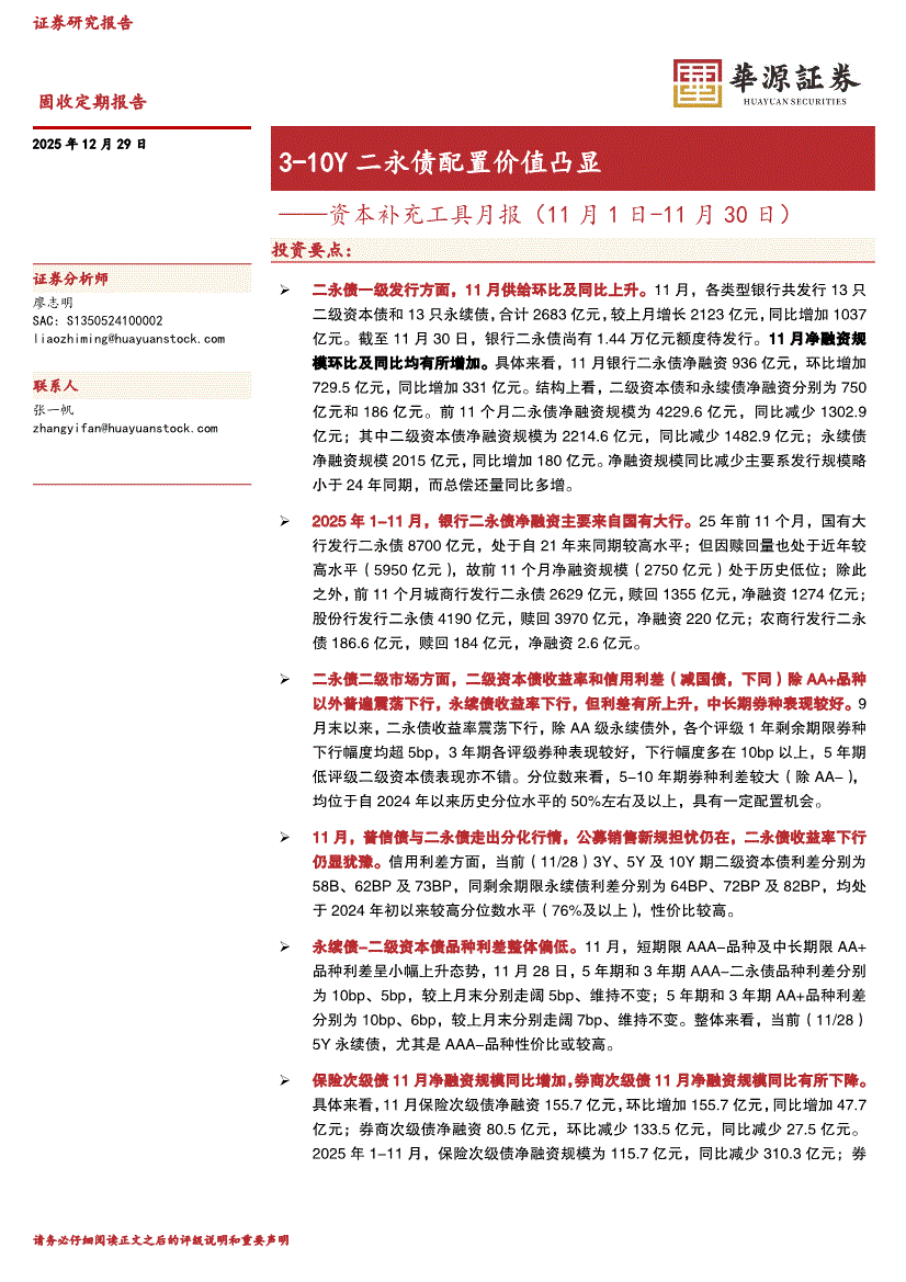 华源证券-资本补充工具月报(11月1日~11月30日):3~10Y二永债配置价值凸显-251229