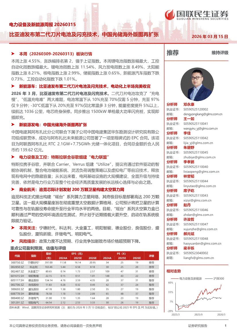 电力设备及新能源行业:国联民生证券-电力设备及新能源行业周报:比亚迪发布第二代刀片电池及闪充技术,中国光储海外版图再扩张-260315