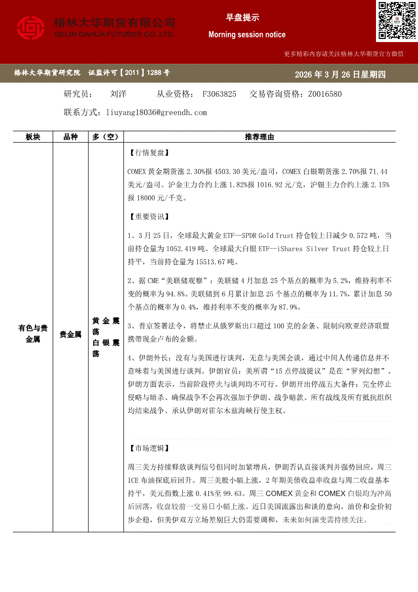 格林大华期货-贵金属早盘提示-260326