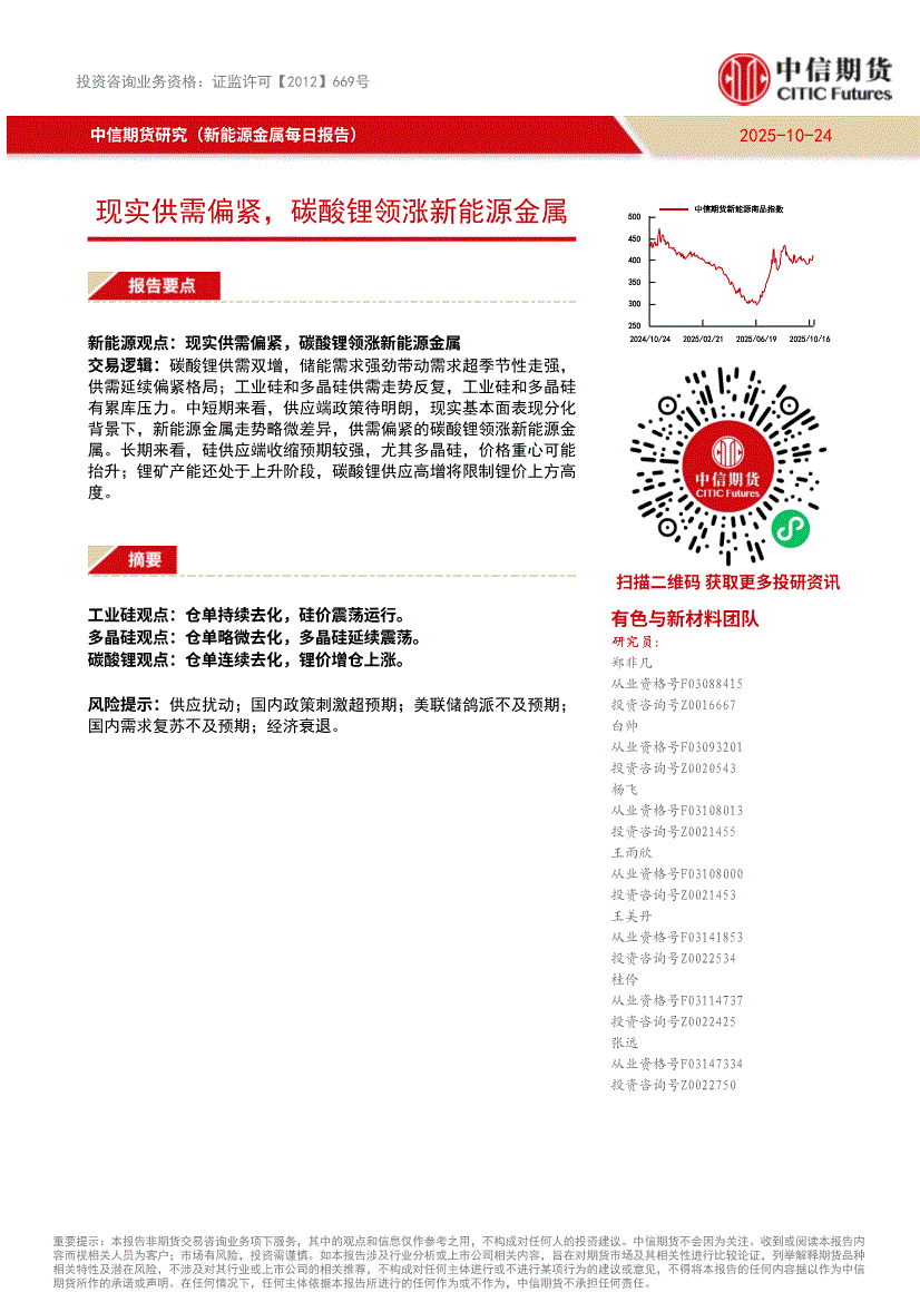 中信期货-新能源金属每日报告:现实供需偏紧,碳酸锂领涨新能源金属-251024