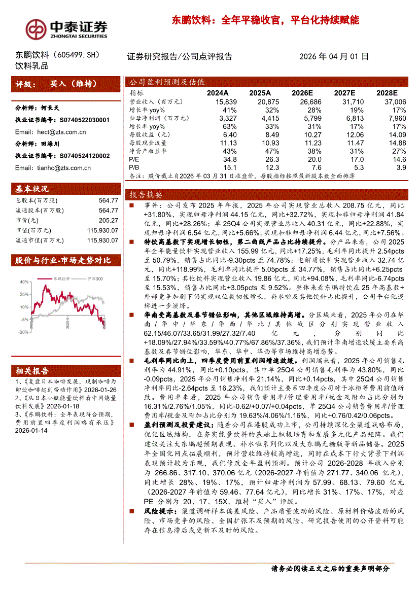 东鹏饮料:中泰证券-东鹏饮料-605499-全年平稳收官,平台化持续赋能-260401