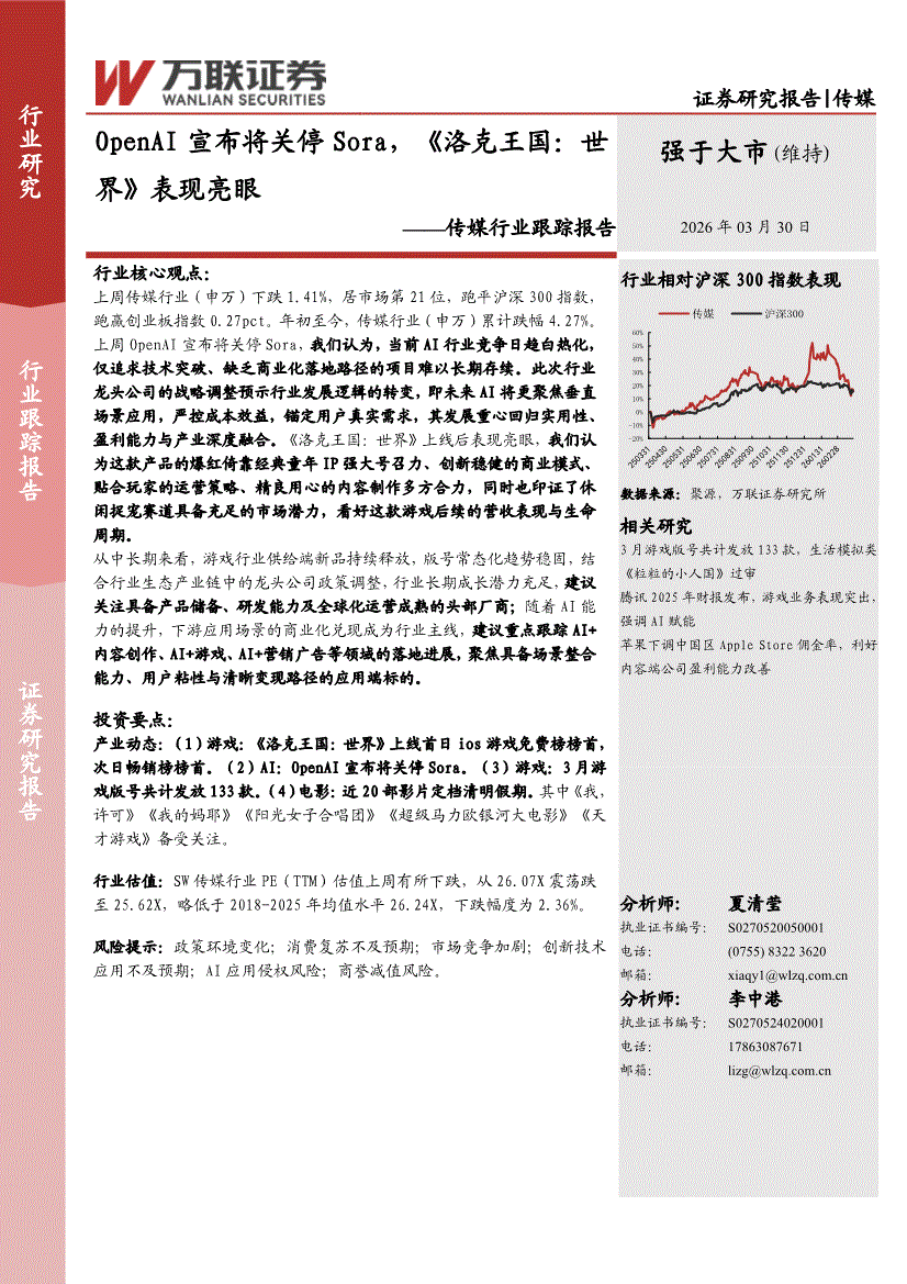 传媒行业:万联证券-传媒行业跟踪报告:OpenAI宣布将关停Sora,《洛克王国,世界》表现亮眼-260330