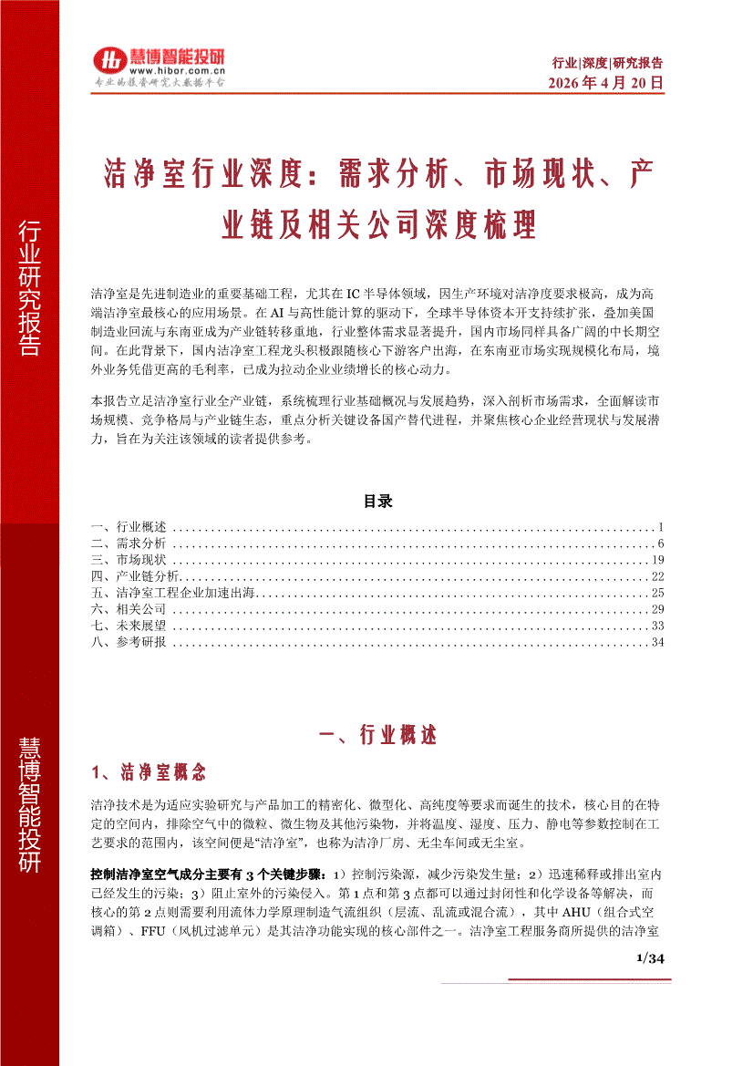 洁净室行业:慧博智能投研-洁净室行业深度:需求分析、市场现状、产业链及相关公司深度梳理-260420